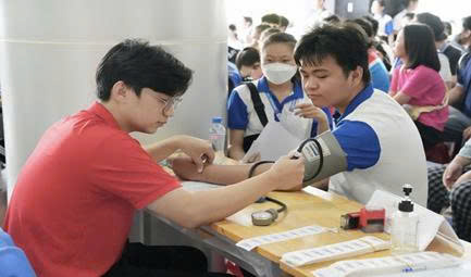Ảnh: Sinh viên đang được kiểm tra sức khỏe trước khi hiến máu