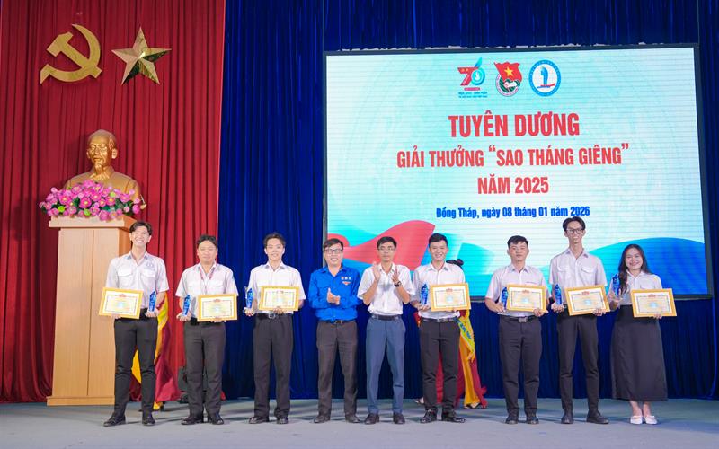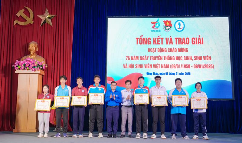 Trong khuôn khổ Lễ họp mặt kỷ niệm, Ban Thường vụ Tỉnh đoàn Đồng Tháp đã tổ chức tuyên dương, trao thưởng cho 2 tập thể và 95 cá nhân đạt danh hiệu “Sinh viên 5 tốt”, “Tập thể sinh viên 5 tốt” năm học 2024 – 2025 và Giải thưởng “Sao Tháng Giêng” năm 2025 cho 10 cá nhân tiêu biểu. Hoạt động tuyên dương được tổ chức trang trọng, đúng quy định, thể hiện sự quan tâm, ghi nhận kịp thời của tổ chức Đoàn – Hội đối với những nỗ lực phấn đấu, rèn luyện và cống hiến của sinh viên; qua đó tiếp tục lan tỏa mạnh mẽ phong trào “Sinh viên 5 tốt”, khẳng định vai trò của Hội Sinh viên trong việc đồng hành, hỗ trợ sinh viên trong lập thân, lập nghiệp.