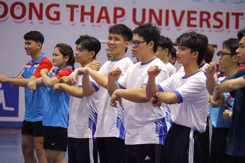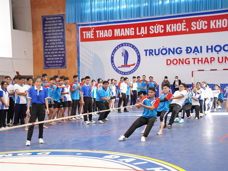 Ảnh: Khởi động các trò chơi dân gian diễn ra trong khuôn viên Trường Đại học Đồng Tháp